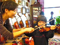 While most students begin taking private music lessons between the ages of four and eight, every child is different. Younger children require more intense involvement from at least one parent; and teenagers may not benefit from any parental oversight at all. Besides age, other factors to consider are the child’s personality, instrumental and musical preferences, expectations, resources (time and money), and your family’s lifestyle; yes, playing an instrument requires a commitment from the entire family. Photo: Hope Academy student, Anna Bai, getting her first violin (1/10 size) at Resonance Violins last week.
