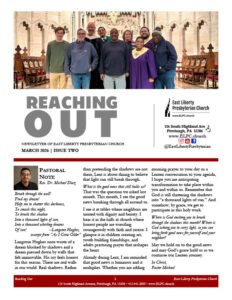 Sign up if you would like to receive Reaching Out via email. Or, if you prefer to receive a copy in the mail, call the church at 412.441.3800.