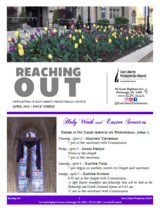 Sign up if you would like to receive Reaching Out via email. Or, if you prefer to receive a copy in the mail, call the Jen King (administrative assistant) at the church at 412.441.3800 x222